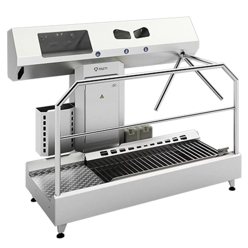 Турникет открывает доступ в производственную зону только после последовательного завершения процесса мойки и дезинфекции рук, об этом сигнализирует световой индикатор зеленого цвета. В стандартной комплектации турникет блокирует выход из производственной зоны. В случае если дезинфицирующее средство закончилось/не подается, и дезинфекция рук не выполняется, тогда турникет блокируется и дальнейшее прохождение невозможно.