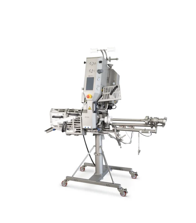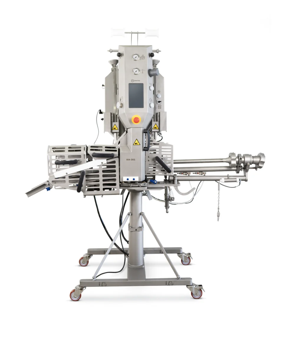 Автоматический клипсатор на П-образной клипсе КН-301 предназначен для изготовления колбас с использованием белковых, полиамидных, фибруозных, а также натуральных оболочек, предназначенных для механического клипсования. Клипсатор позволяет выпускать колбасные изделия в виде одиночных батонов, цепочек батонов с петлей, а также кольцевых колбас с нитью.