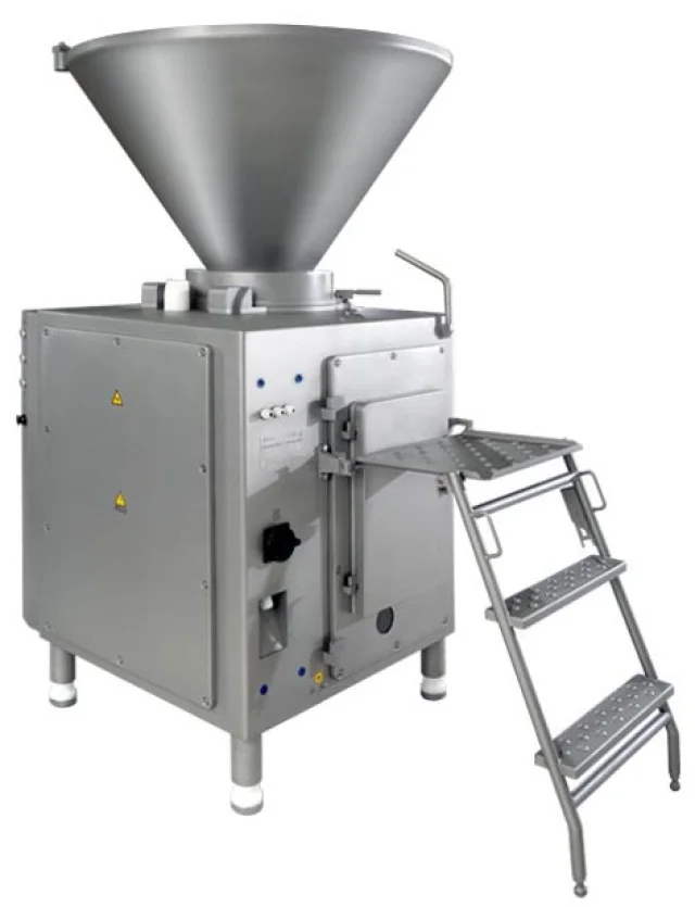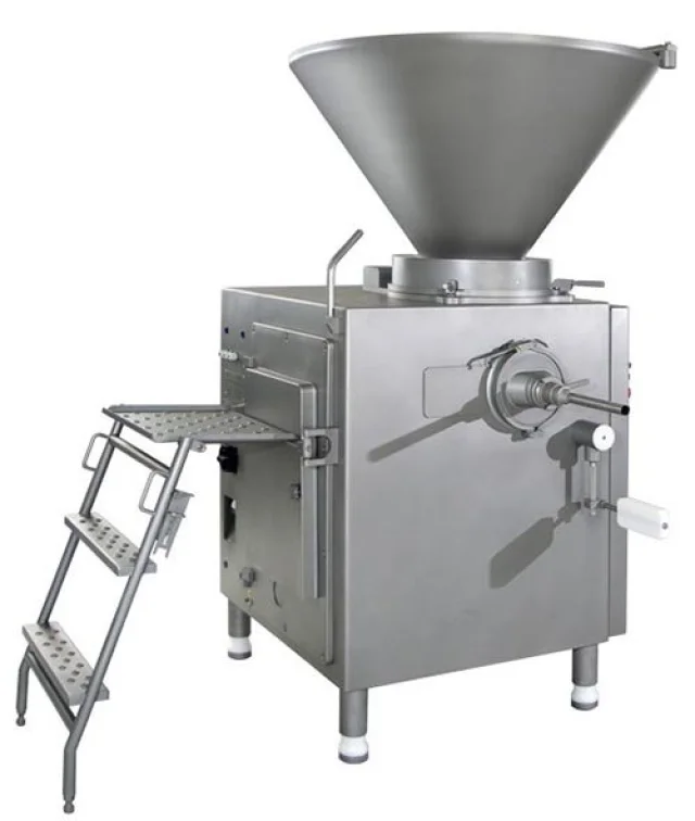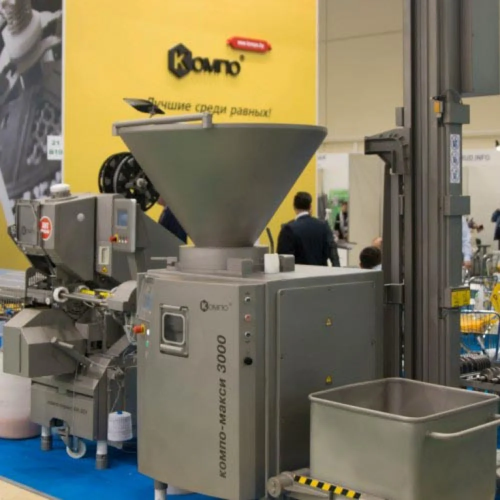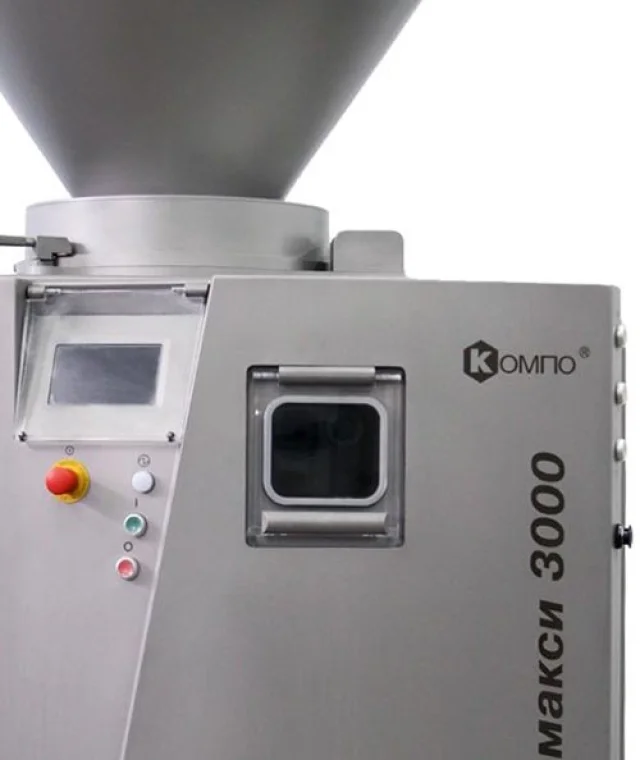 Вакуумный колбасный шприц винтового типа КОМПО МАКСИ 3000 предназначен для наполнения и дозирования фаршей варёных, варёно-копченых, полукопченых, сырокопченых и сыровяленых колбас, сосисок, сарделек, а также других пастообразных масс.