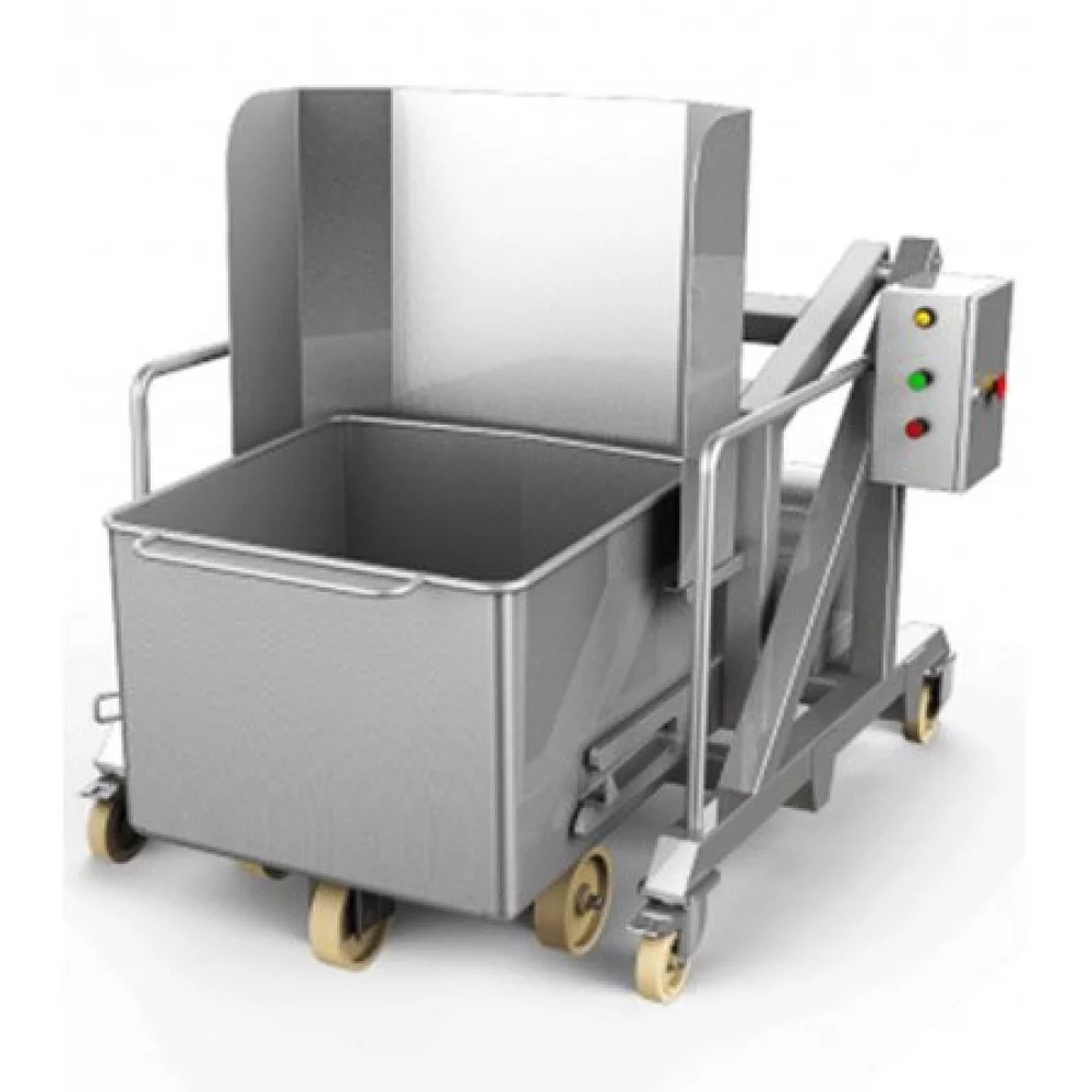 Тележка с сырьем вкатывается в захват подъемника и фиксируется запорным механизмом.