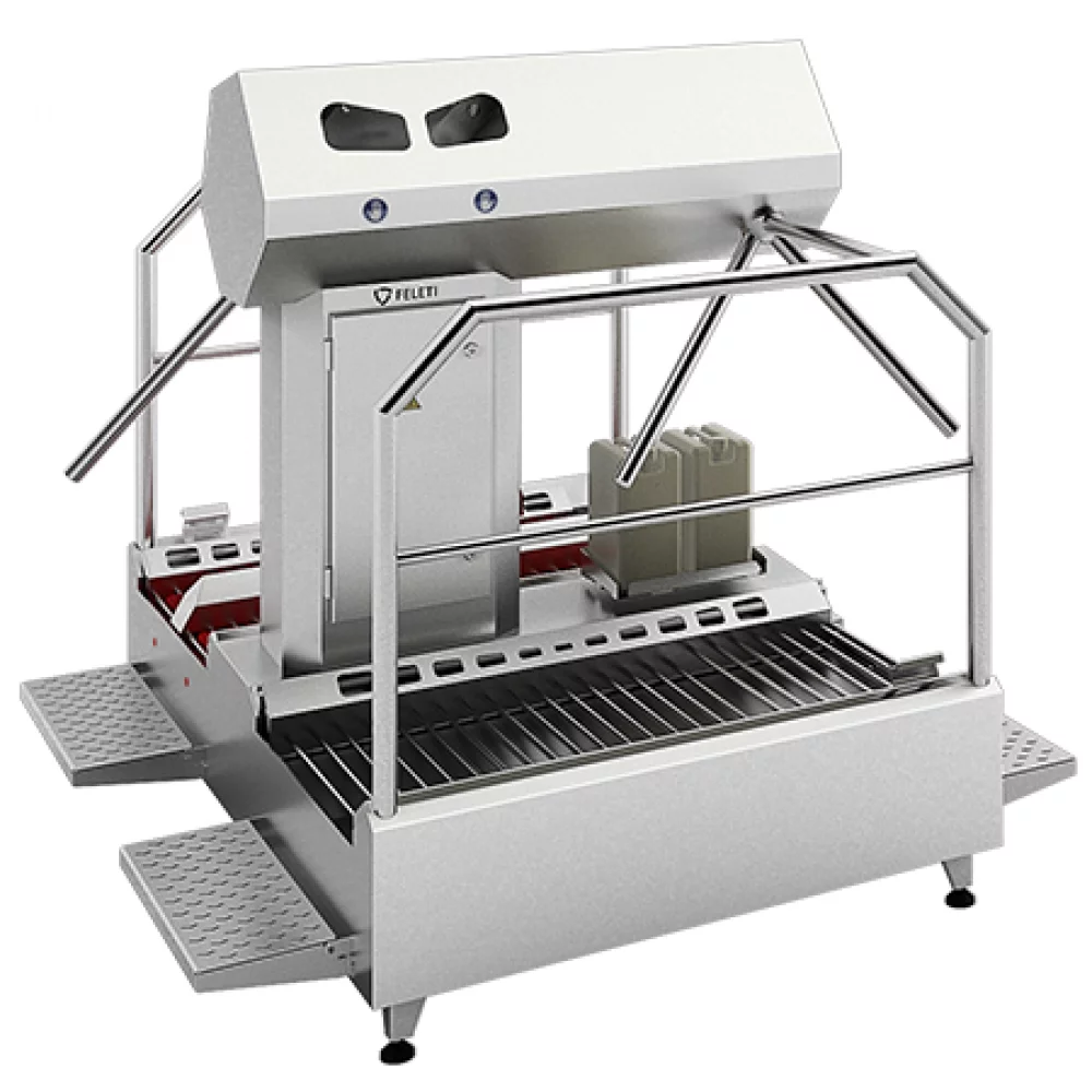 Для мойки и чистки подошв обуви станция гигиены оснащена двумя вращающимися горизонтальными щетками. Для прохода по щеткам предусмотрена специальная решетка. Вращение щеток и подача моющего раствора активируются фотоэлементом расположенным на корпусе станции. Время мойки регулируется от 1 до 20 сек. Подача моющего раствора на щетки происходит при помощи форсунок, гарантирующих равномерную подачу раствора по всей поверхности щеток. Концентрация моющего раствора регулируется инжектором за счет изменения величины проходного сечения. Демонтаж щеток производится без применения инструмента.