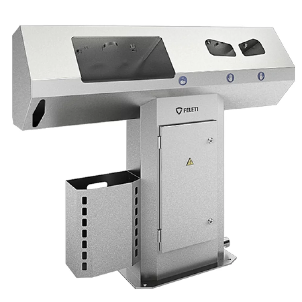Включение подачи дезинфицирующего средства происходит при поднесении обеих рук в зону срабатывания фотоэлементов, расположенных в дезинфицирующей камере. Дезинфицирующее средство подается автоматически при помощи электронасоса. Распыление дезсредства осуществляют 4 форсунки, расположенные в верхней и нижней части дезинфицирующей камеры.